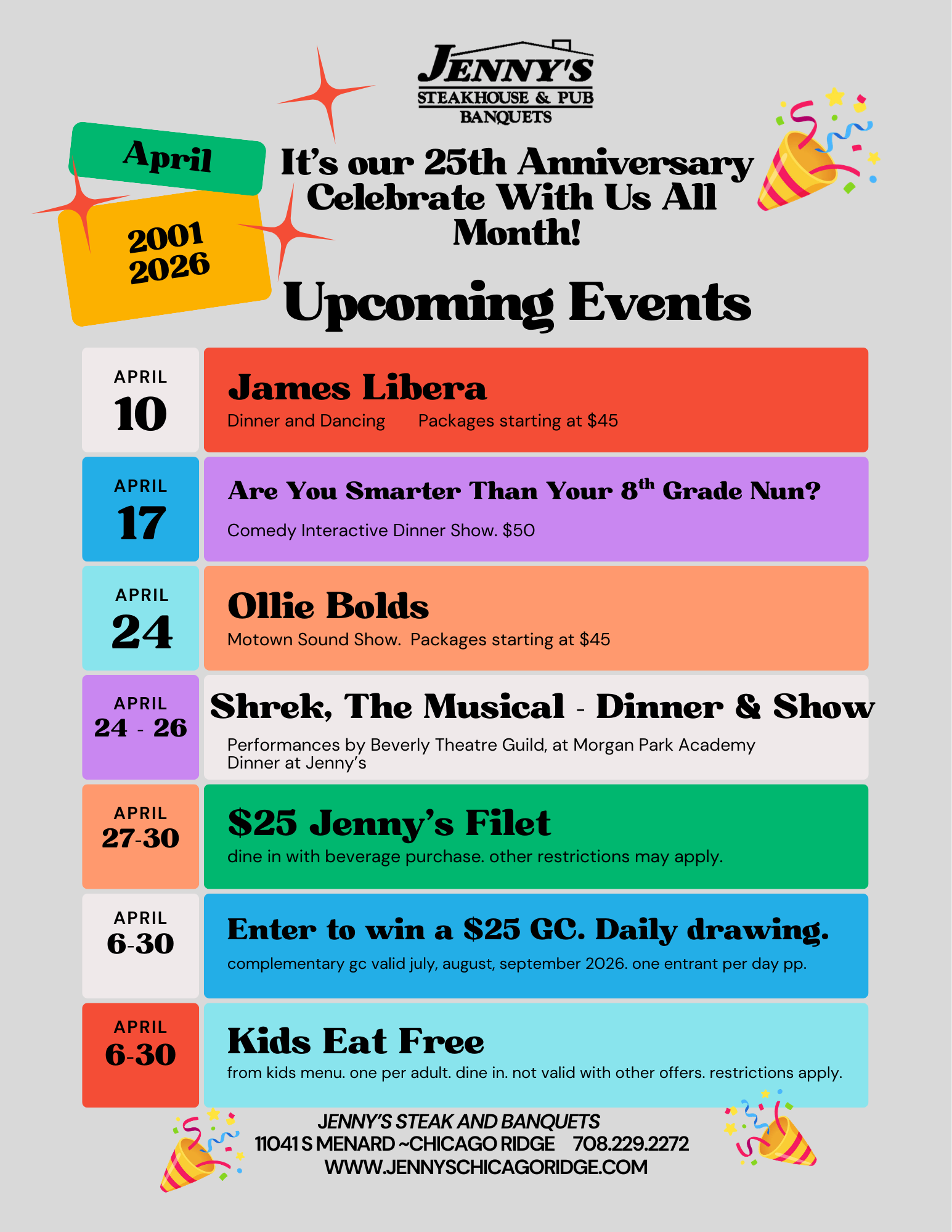It has been our pleasure to be one of Chicagoland's southside restaurants that have served delicious menu items for over two decades. Steaks, seafood, chicken, pasta, burgers, and more are served 7 days a week. Carl and Gina Courtright along with Chef Juan created this great neighborhood restaurant twenty-plus years ago. And now under Juan's guidance, Chef Jorge is ready to create some of the time-honored traditions that our diners have grown to love. Todd, the general manager, and Carl and Gina's son is third generation restauranteur. He is on a mission to continue to make Jenny's a great place to eat for another 20+ years. We are open seven days a week for lunch and dinner. Jenny's banquet room is the perfect place to host your next gathering. From memorials to baptisms, our staff is ready to serve you!